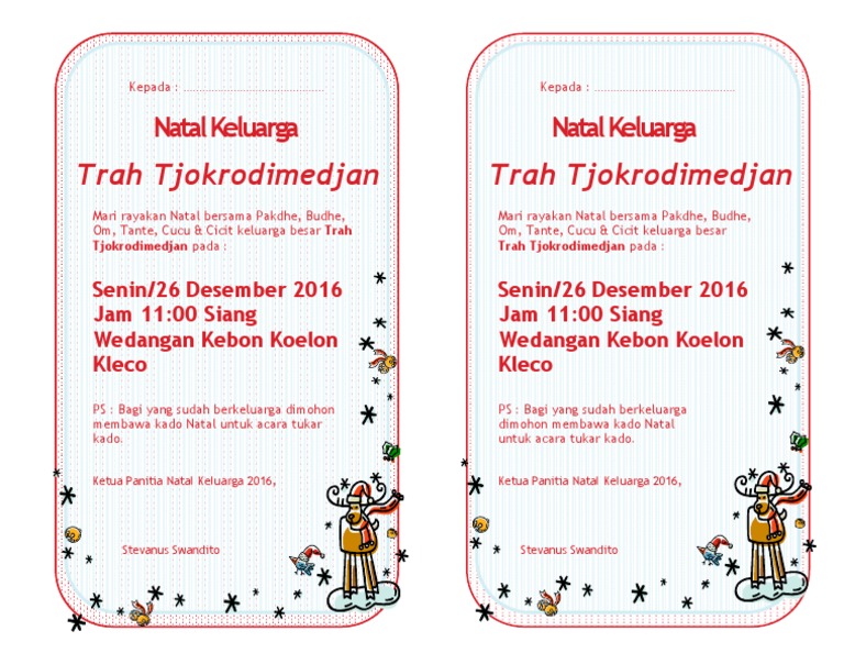 Besar harapan kami kiranya bapak/ibu saudara/i dapat menghadiri perayaan natal yang kami selenggarakan, atas kerjasama dan. Panitia natal ikatan mahasiswa papua (imapa). Contoh undangan natal stm (serikat tolong menolong) dalam suatu lingkungan kelurahan. Dalam mendesain undangan ternyata tidak melulu soal bentuknya. Berikut ini adalah beberapa contoh undangan natal yang kreatif yang bisa dijadikan referensi dalam mendesain sebuah undangan untuk perayaan natal.